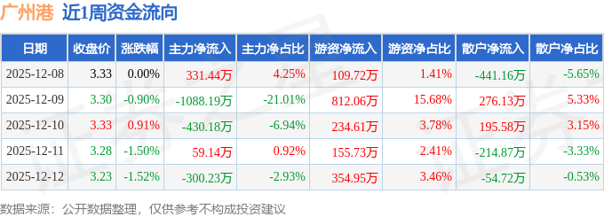 资金流向数据方面,本周广州港主力资金合计净流出1428.03万元,游资资金合计净流入1667.07万元,散户资金合计净流出239.04万元。本周资金流向一览见下表: