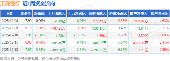 证券之星消息,截至2025年12月12日收盘,工商银行(601398)报收于7.97元,较上周的7.99元下跌0.25%。本周,工商银行12月9日盘中最高价报8.15元。12月12日盘中最低价报7.84元。工商银行当前最新总市值28405.58亿元,在国有大型银行板块市值排名1/6,在两市A股市值排名1/5170。