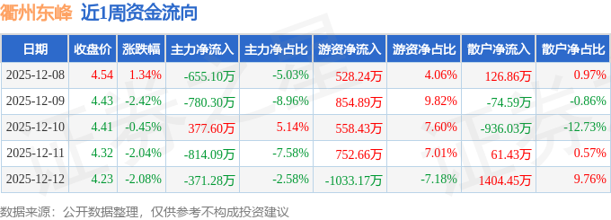 资金流向数据方面,本周衢州东峰主力资金合计净流出2243.16万元,游资资金合计净流入1661.04万元,散户资金合计净流入582.12万元。本周资金流向一览见下表: