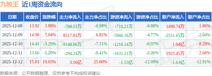 资金流向数据方面,本周九牧王主力资金合计净流入2.99亿元,游资资金合计净流出2.48亿元,散户资金合计净流出5103.68万元。本周资金流向一览见下表: