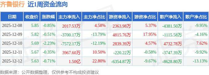 资金流向数据方面,本周齐鲁银行主力资金合计净流入9696.46万元,游资资金合计净流入3444.04万元,散户资金合计净流出1.31亿元。本周资金流向一览见下表: