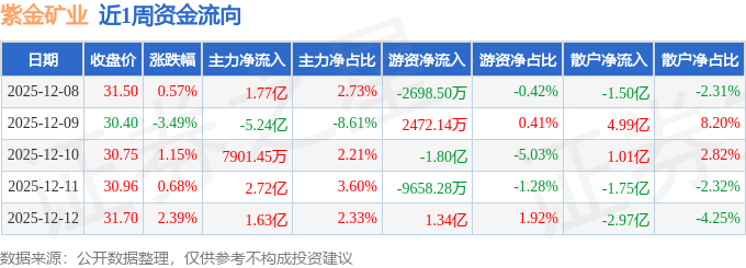 沪深股通持股方面,截止2025年12月12日收盘,紫金矿业沪股通持股数为16.87亿股,占流通股比为821.0%。