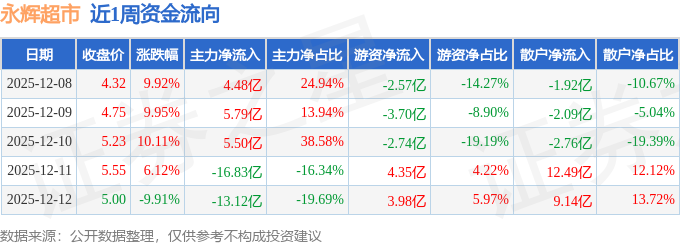 资金流向数据方面,本周永辉超市主力资金合计净流出14.18亿元,游资资金合计净流出6770.58万元,散户资金合计净流入14.85亿元。本周资金流向一览见下表: