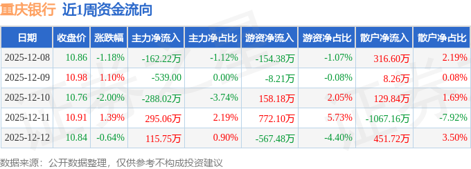 资金流向数据方面,本周重庆银行主力资金合计净流出39.47万元,游资资金合计净流入200.21万元,散户资金合计净流出160.74万元。本周资金流向一览见下表: