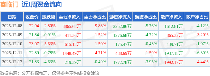资金流向数据方面,本周喜临门主力资金合计净流入6121.31万元,游资资金合计净流出4989.1万元,散户资金合计净流出1132.21万元。本周资金流向一览见下表:
