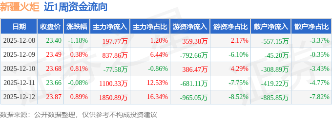 资金流向数据方面,本周新疆火炬主力资金合计净流入3909.28万元,游资资金合计净流出1692.97万元,散户资金合计净流出2216.31万元。本周资金流向一览见下表: