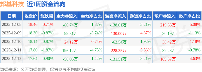 资金流向数据方面,本周邦基科技主力资金合计净流出410.6万元,游资资金合计净流入25.68万元,散户资金合计净流入384.92万元。本周资金流向一览见下表: