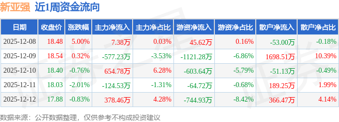 资金流向数据方面,本周新亚强主力资金合计净流入338.86万元,游资资金合计净流出2488.95万元,散户资金合计净流入2150.09万元。本周资金流向一览见下表: