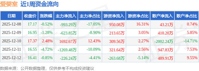 资金流向数据方面,本周爱婴室主力资金合计净流出1420.18万元,游资资金合计净流入1531.26万元,散户资金合计净流出111.08万元。本周资金流向一览见下表: