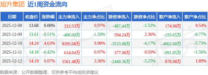 资金流向数据方面,本周旭升集团主力资金合计净流入1.05亿元,游资资金合计净流出5489.63万元,散户资金合计净流出4994.31万元。本周资金流向一览见下表:
