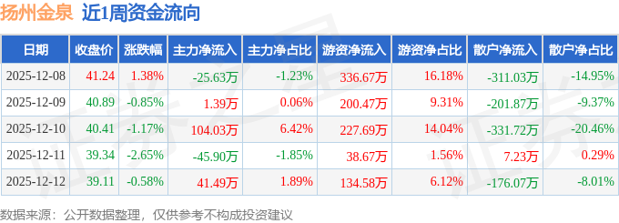 资金流向数据方面,本周扬州金泉主力资金合计净流入75.39万元,游资资金合计净流入938.08万元,散户资金合计净流出1013.46万元。本周资金流向一览见下表: