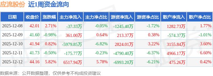 资金流向数据方面,本周应流股份主力资金合计净流入685.99万元,游资资金合计净流出9991.61万元,散户资金合计净流入9305.63万元。本周资金流向一览见下表: