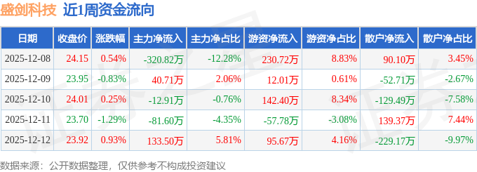 资金流向数据方面,本周盛剑科技主力资金合计净流出241.12万元,游资资金合计净流入423.02万元,散户资金合计净流出181.9万元。本周资金流向一览见下表:
