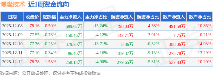 资金流向数据方面,本周博隆技术主力资金合计净流出1563.87万元,游资资金合计净流出137.14万元,散户资金合计净流入1701.01万元。本周资金流向一览见下表: