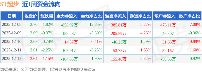 资金流向数据方面,本周ST起步主力资金合计净流出1214.41万元,游资资金合计净流入754.4万元,散户资金合计净流入460.01万元。本周资金流向一览见下表:
