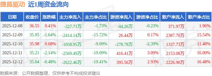 资金流向数据方面,本周捷昌驱动主力资金合计净流出8992.75万元,游资资金合计净流入515.38万元,散户资金合计净流入8477.37万元。本周资金流向一览见下表: