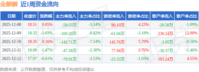 资金流向数据方面,本周金麒麟主力资金合计净流出498.92万元,游资资金合计净流入219.43万元,散户资金合计净流入279.49万元。本周资金流向一览见下表: