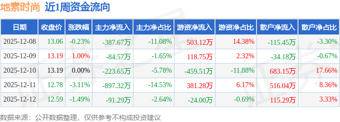资金流向数据方面,本周地素时尚主力资金合计净流出1684.49万元,游资资金合计净流入519.64万元,散户资金合计净流入1164.86万元。本周资金流向一览见下表: