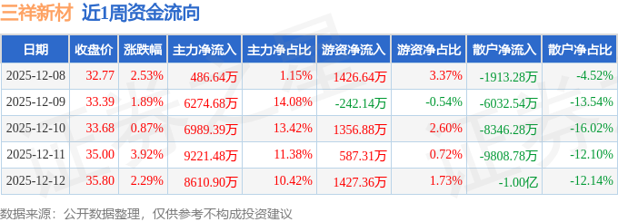 资金流向数据方面,本周三祥新材主力资金合计净流入3.16亿元,游资资金合计净流入4556.06万元,散户资金合计净流出3.61亿元。本周资金流向一览见下表: