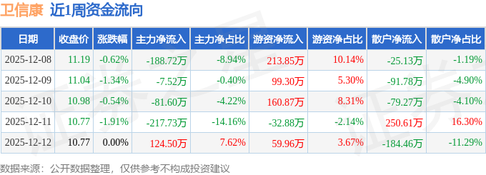 资金流向数据方面,本周卫信康主力资金合计净流出371.07万元,游资资金合计净流入501.09万元,散户资金合计净流出130.03万元。本周资金流向一览见下表: