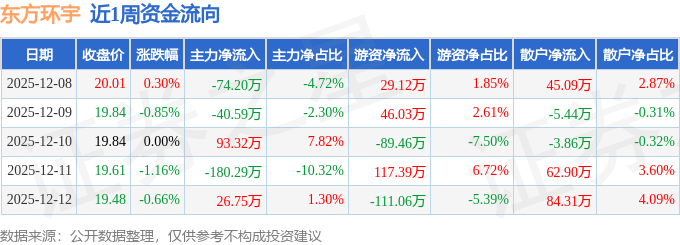 资金流向数据方面,本周东方环宇主力资金合计净流出175.01万元,游资资金合计净流出7.99万元,散户资金合计净流入183.0万元。本周资金流向一览见下表: