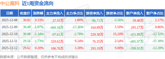资金流向数据方面,本周中公高科主力资金合计净流出93.89万元,游资资金合计净流入977.02万元,散户资金合计净流出883.13万元。本周资金流向一览见下表:
