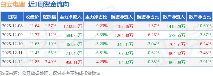 资金流向数据方面,本周白云电器主力资金合计净流入399.6万元,游资资金合计净流入952.4万元,散户资金合计净流出1352.0万元。本周资金流向一览见下表: