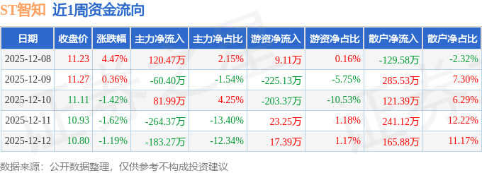 资金流向数据方面,本周ST智知主力资金合计净流出305.58万元,游资资金合计净流出378.76万元,散户资金合计净流入684.34万元。本周资金流向一览见下表: