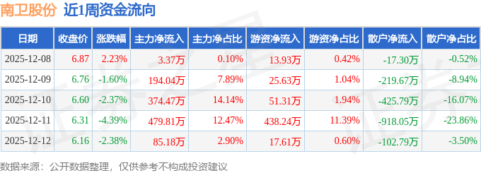 资金流向数据方面,本周南卫股份主力资金合计净流入1136.88万元,游资资金合计净流入546.72万元,散户资金合计净流出1683.6万元。本周资金流向一览见下表:
