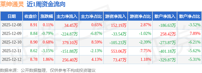 资金流向数据方面,本周莱绅通灵主力资金合计净流入293.19万元,游资资金合计净流入639.95万元,散户资金合计净流出933.14万元。本周资金流向一览见下表: