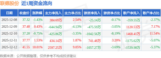 资金流向数据方面,本周联德股份主力资金合计净流入2345.28万元,游资资金合计净流出1859.07万元,散户资金合计净流出486.2万元。本周资金流向一览见下表: