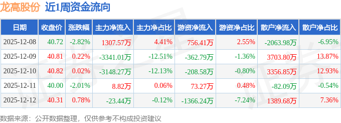 资金流向数据方面,本周龙高股份主力资金合计净流出5196.32万元,游资资金合计净流出1107.93万元,散户资金合计净流入6304.25万元。本周资金流向一览见下表: