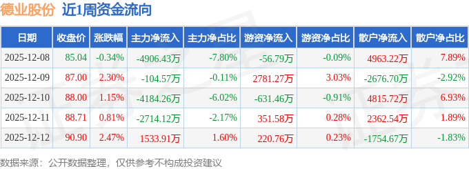 资金流向数据方面,本周德业股份主力资金合计净流出1.04亿元,游资资金合计净流入2665.35万元,散户资金合计净流入7710.11万元。本周资金流向一览见下表: