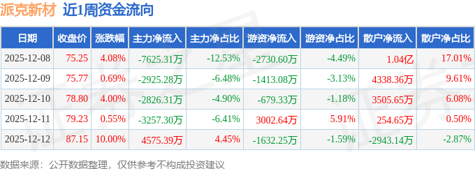 资金流向数据方面,本周派克新材主力资金合计净流出1.21亿元,游资资金合计净流出3452.63万元,散户资金合计净流入1.55亿元。本周资金流向一览见下表: