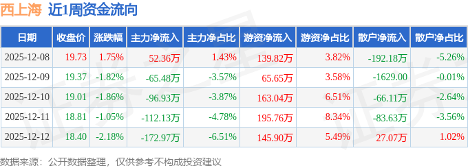 资金流向数据方面,本周西上海主力资金合计净流出395.14万元,游资资金合计净流入710.16万元,散户资金合计净流出315.02万元。本周资金流向一览见下表: