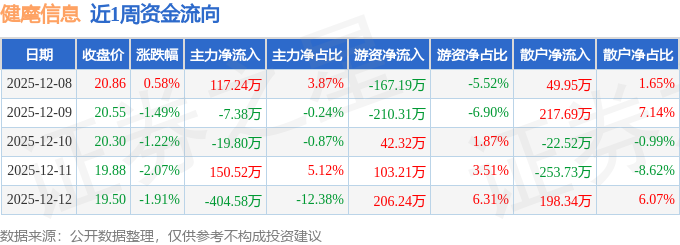 资金流向数据方面,本周健麾信息主力资金合计净流出164.01万元,游资资金合计净流出25.72万元,散户资金合计净流入189.74万元。本周资金流向一览见下表: