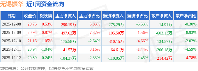 资金流向数据方面,本周无锡振华主力资金合计净流入649.43万元,游资资金合计净流入94.93万元,散户资金合计净流出744.36万元。本周资金流向一览见下表: