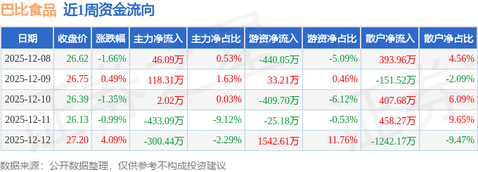 资金流向数据方面,本周巴比食品主力资金合计净流出567.11万元,游资资金合计净流入700.89万元,散户资金合计净流出133.78万元。本周资金流向一览见下表: