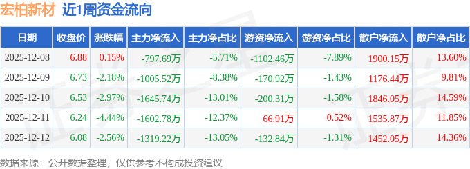 资金流向数据方面,本周宏柏新材主力资金合计净流出6370.94万元,游资资金合计净流出1539.62万元,散户资金合计净流入7910.56万元。本周资金流向一览见下表: