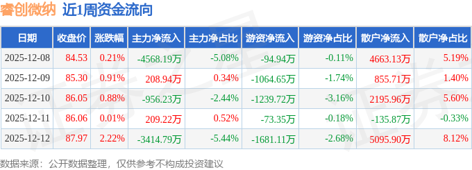 资金流向数据方面,本周睿创微纳主力资金合计净流出8521.05万元,游资资金合计净流出4153.77万元,散户资金合计净流入1.27亿元。本周资金流向一览见下表: