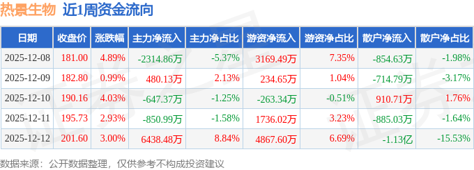 资金流向数据方面,本周热景生物主力资金合计净流入3105.39万元,游资资金合计净流入9744.42万元,散户资金合计净流出1.28亿元。本周资金流向一览见下表: