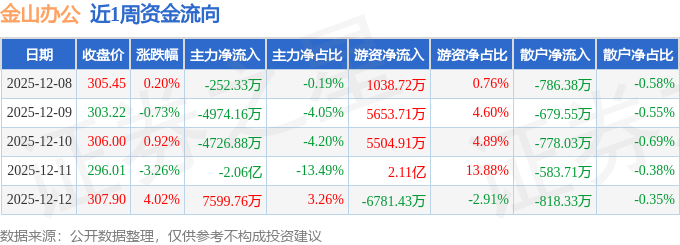 资金流向数据方面,本周金山办公主力资金合计净流出2.29亿元,游资资金合计净流入2.66亿元,散户资金合计净流出3646.01万元。本周资金流向一览见下表:
