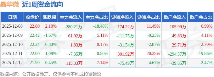 资金流向数据方面,本周晶华微主力资金合计净流出108.48万元,游资资金合计净流入257.36万元,散户资金合计净流出148.89万元。本周资金流向一览见下表:
