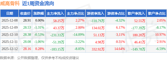 资金流向数据方面,本周威高骨科主力资金合计净流出364.26万元,游资资金合计净流入412.27万元,散户资金合计净流出48.02万元。本周资金流向一览见下表: