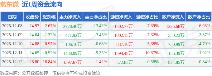 资金流向数据方面,本周燕东微主力资金合计净流出3346.96万元,游资资金合计净流入4363.74万元,散户资金合计净流出1016.78万元。本周资金流向一览见下表: