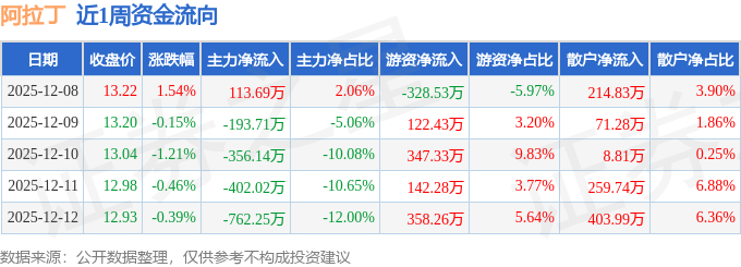 资金流向数据方面,本周阿拉丁主力资金合计净流出1600.43万元,游资资金合计净流入641.78万元,散户资金合计净流入958.65万元。本周资金流向一览见下表: