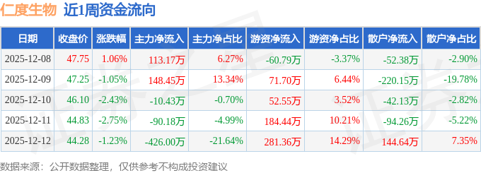 资金流向数据方面,本周仁度生物主力资金合计净流出264.99万元,游资资金合计净流入529.27万元,散户资金合计净流出264.28万元。本周资金流向一览见下表: