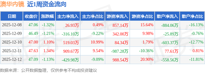 资金流向数据方面,本周澳华内镜主力资金合计净流入709.56万元,游资资金合计净流入1284.73万元,散户资金合计净流出1994.29万元。本周资金流向一览见下表:
