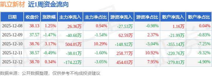资金流向数据方面,本周凯立新材主力资金合计净流入277.59万元,游资资金合计净流入598.95万元,散户资金合计净流出876.54万元。本周资金流向一览见下表: