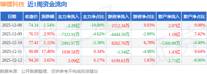 资金流向数据方面,本周臻镭科技主力资金合计净流出1.11亿元,游资资金合计净流出3220.23万元,散户资金合计净流入1.43亿元。本周资金流向一览见下表: